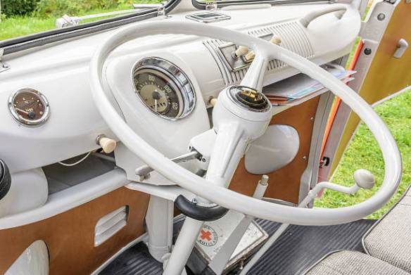 Jüchen, Germany – August 5, 2016: 1950s Volkswagen Transporter T1 campervan dashboard interior with open doors parked in a park. The Volkswagen Transporter is a popular van to use as a camper and was delivered originally as a camper van, but many have been converted later. The car is on display during the 2016 Classic Days at castle Dyck.